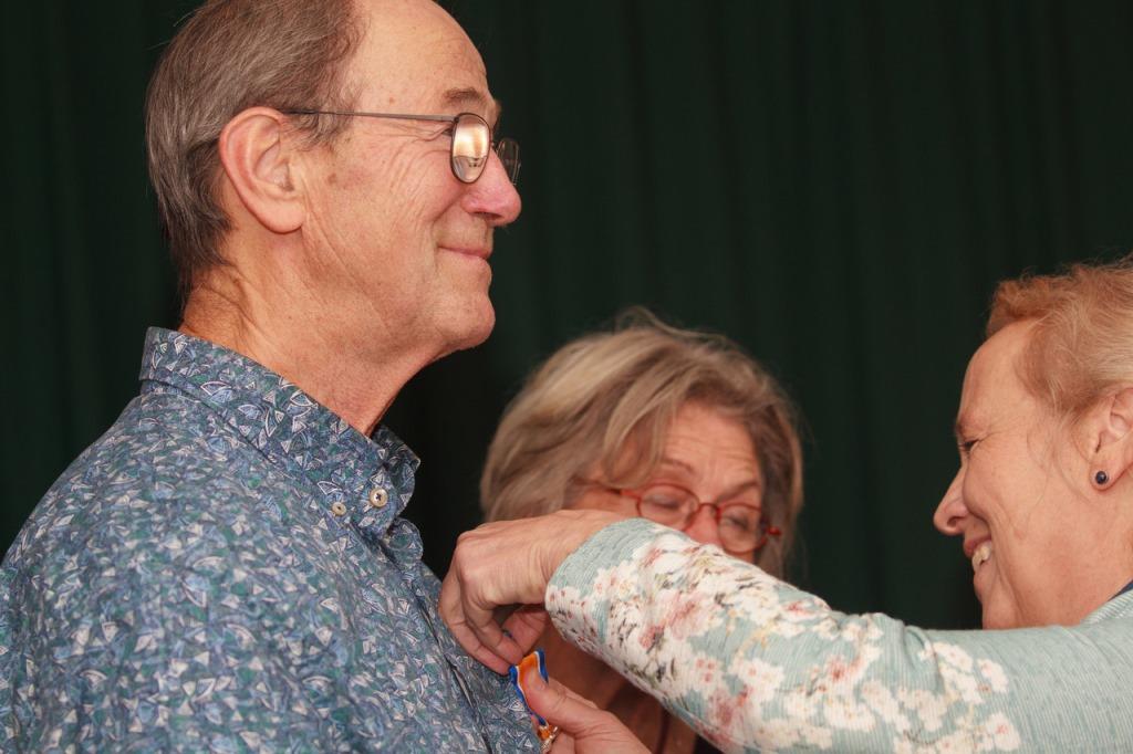 Joop Verburg krijgt de onderscheiding van Ridder in de Orde van Oranje Nassau opgespeld door Burgermeester Inge Nieuwenhuizen van gemeente De Wolden (foto Geert de Vries)
